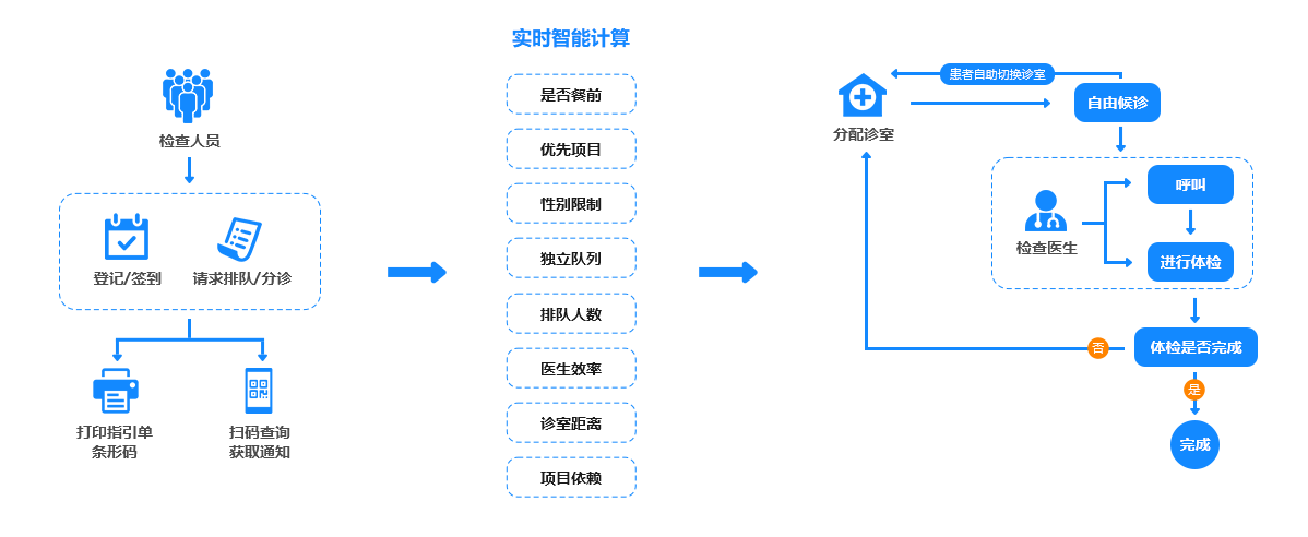 实时为受检者多维度计算最优诊室进行分诊,整个过程更科学、高效