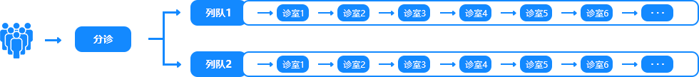 彩超等需要长时间等待的项目可以单独一个队列排队,受检者可根据排队等待时间的长短选择是否去其他等待时间短的诊室就诊。以此来增加资源利用率。